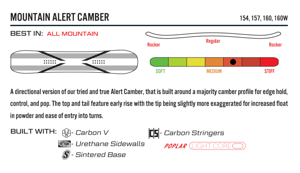 - Directional Alert Camber: This camber profile is designed for freeriding, providing excellent edge hold, control, and pop. The tip and tail feature early rise, with a slightly exaggerated tip for enhanced float in powder and smooth entry into turns.
